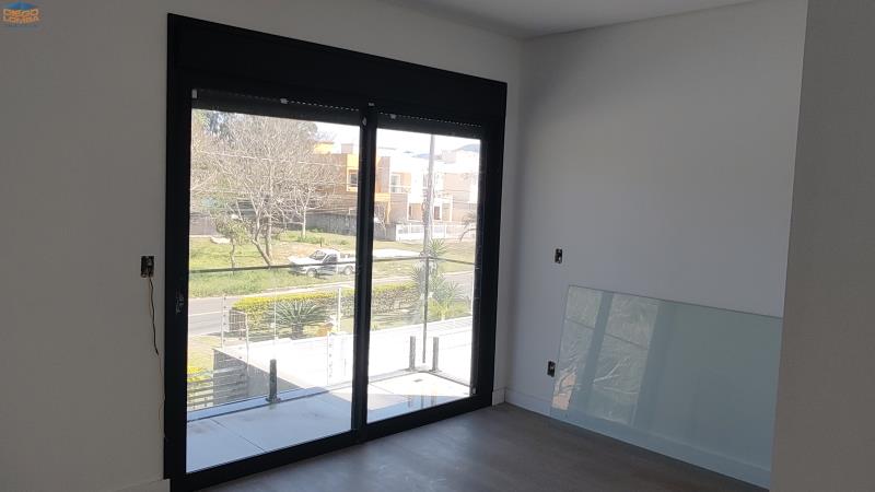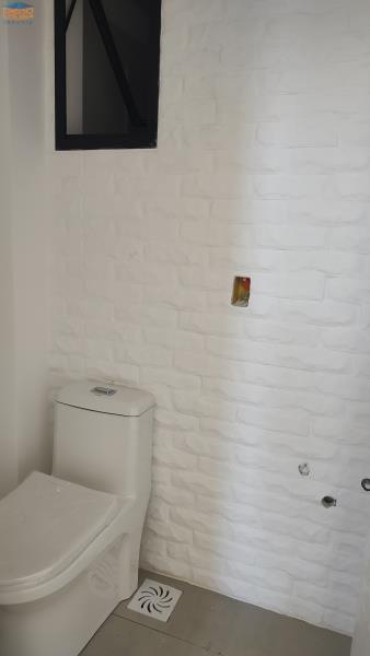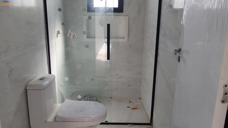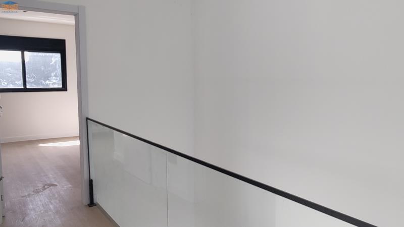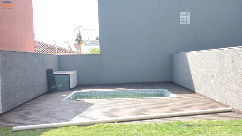 Sobrado com salas e cozinha integradas no térreo, com lavabo interno e outro externo para piscina e churrasqueira.